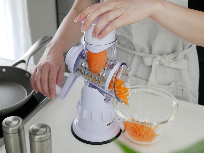 ハンドルをくるくる回すだけ。スライス・細切り・すりおろしの3種類のステンレスドラムが付属しているから、これ一台で料理の手間がぐっとなくなります。