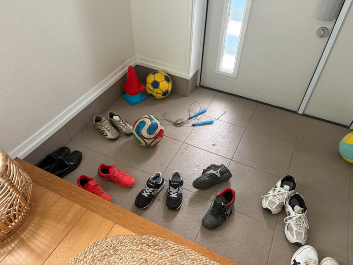 玄関を開けた瞬間、息子たちの活発な足跡(と散らかった靴たち)がお出迎え。